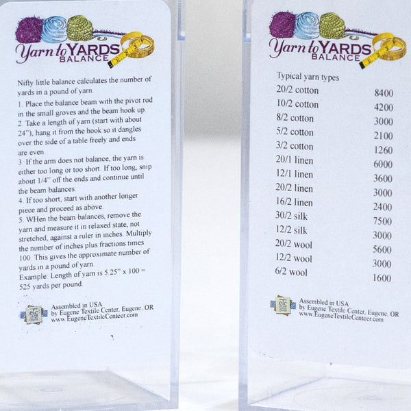 A lot of information in a small package! You'll wonder how you got along without this indispensable tool for dealing with unidentified, mystery yarn. To find the yards per pound loop a strand of yarn over the balancing arm. Trim the yarn until the arm balances. Remove the yarn, measure it in inches and multiple the length by 100. That number will be an estimate of the number of yards per pound. If you know how many yards are in a pound, and the weight of your leftovers, simple math will tell you how many yards of yarn you have. The balance stands 6.25 in tall, and works with any yarn. Assembled in US.